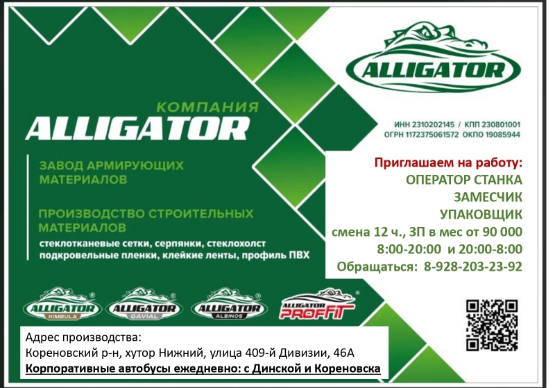 Корпоративный транспорт (вахта).официальное трудоустройство по ТК РФ в штат компании, оплата больничных и отпусков.график работы 5/2 с 8 до 8ч. ( смены чередуются- 5 дней день, потом 5 дней ночь)Субботы и воскресенье - выходные.ТРЕБОВАНИЯ:Вы готовы быстро вникать в работу, внимательны и аккуратны;Рассматриваем кандидатов без опыта работы, но с желанием обучатьсяМы группа компаний "ALLIGATOR" - это команда профессионалов, преданных делу создания надежных и долговечных строительных материалов. Наши материалы запатентованными под марками «Kimbula», «Gavial», «ProfFit».